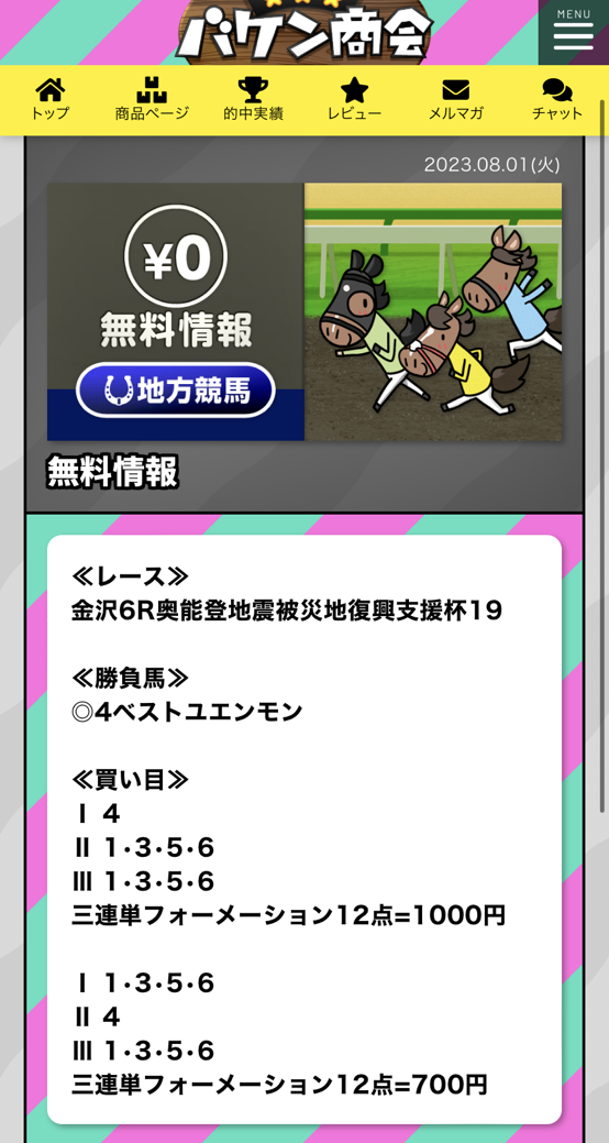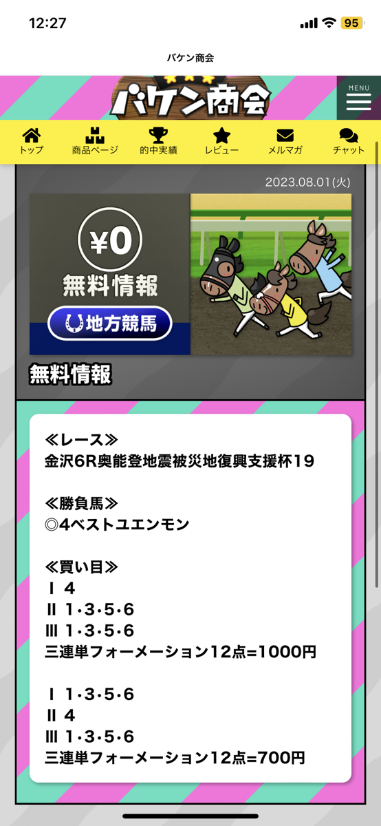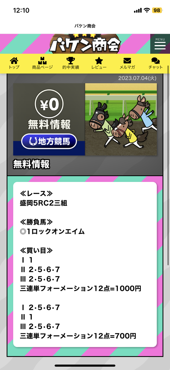 7月4日(火)無料情報【盛岡5R】で3連単59.7倍的中で払い戻し「5万9700円」貰えました! バケン商会の無料情報は相性良すぎる!