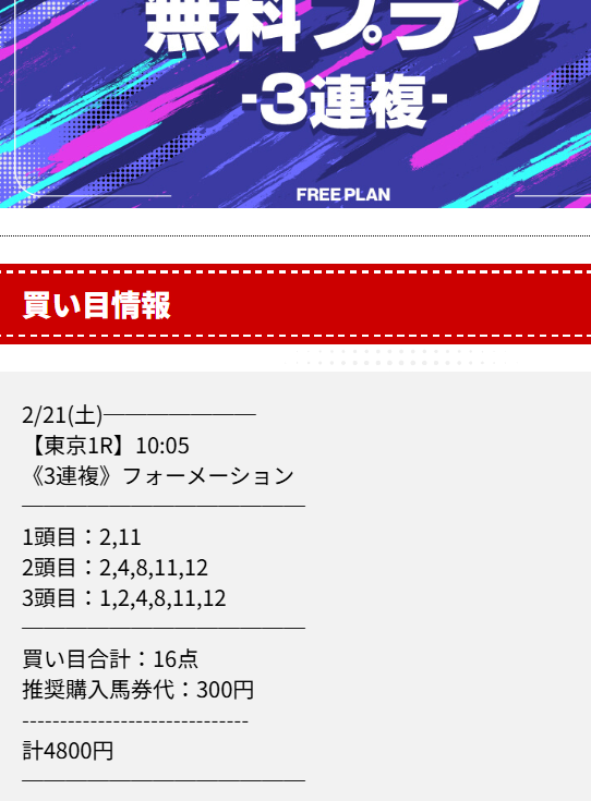 どの情報が的中確立高いか聞いてオススメされたので初回利用してみました。