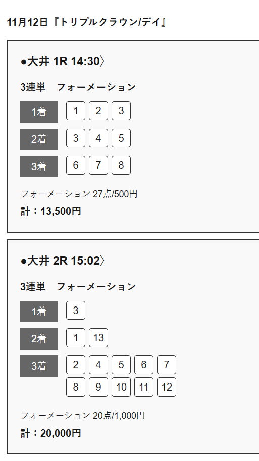 大井1R目で46万9050円的中、次なる大井2Rはめっちゃ惜しくて不的中! 何で①の11番人気を2着固定しちゃったかな、保険で3着目にも入れておいてくれれば3連単528倍の万馬券だったのに! こういう不的中でも意図が見える予想は使ってて面白い、しかも大井1R目では3連単938倍当たってるから何も言えねえっていう!(笑) 継続して地方競馬使おうと思います!