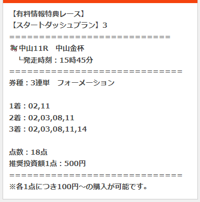 おそらく初回しか適応されない『スタートダッシュプラン』想定配当30~50万円、通常価格→7万円が9,800円。 安いし負けてもいいや感覚でやったらスタートダッシュどころか上半期分の収支をたった1レースで稼がせてもらいました。 フェアリーステークス15-4-1的中で、結果は公式乗ってるので引用はしませんが払い戻しは1点200円で賭けていたので175万8160円払い戻し、想定配当×3倍以上!
