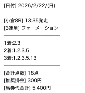 5400円の馬券代、点数18点で1475850円的中。